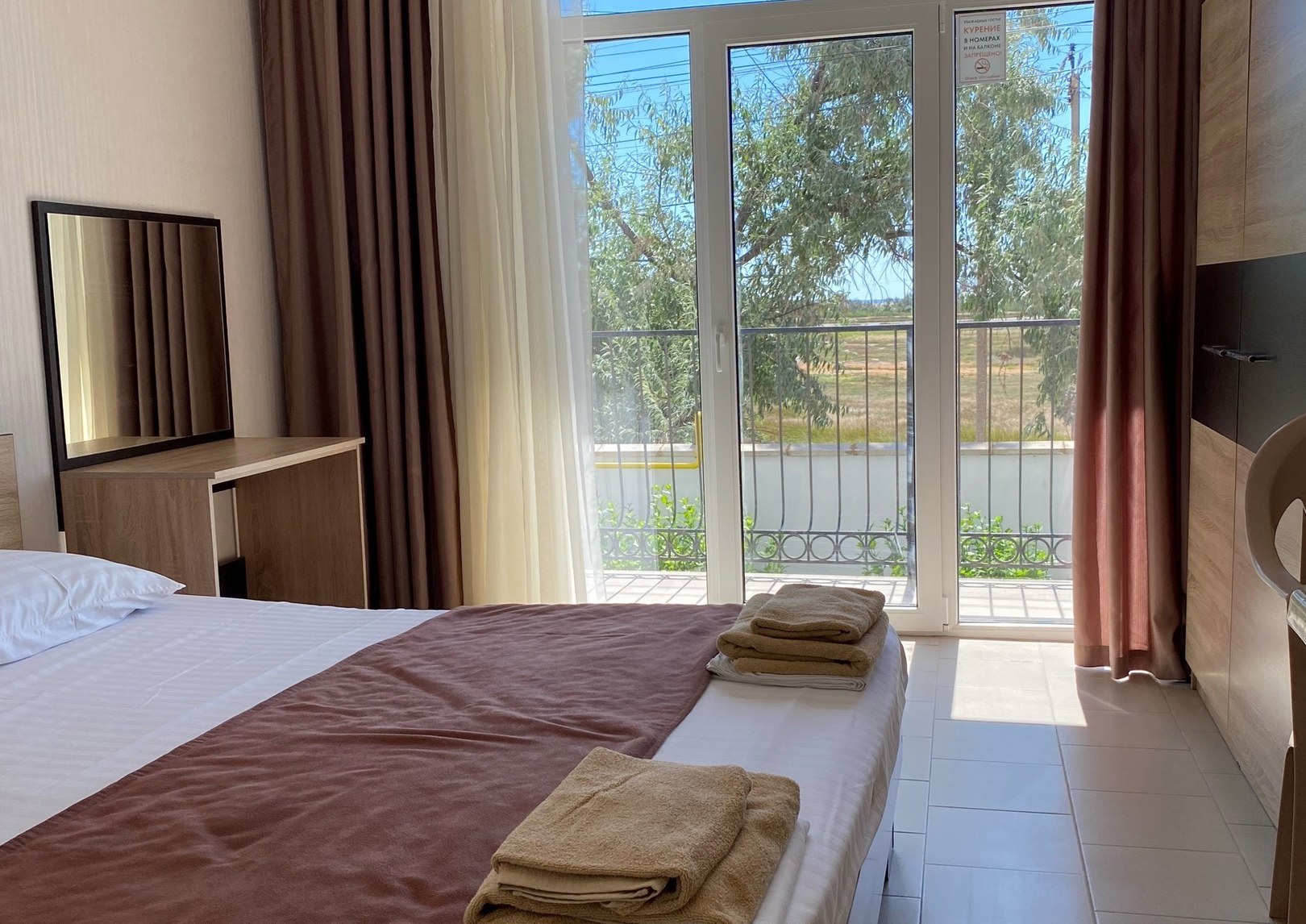 - Мебель: кровать двуспальная, прикроватные тумбочки, столик туалетный, шкаф