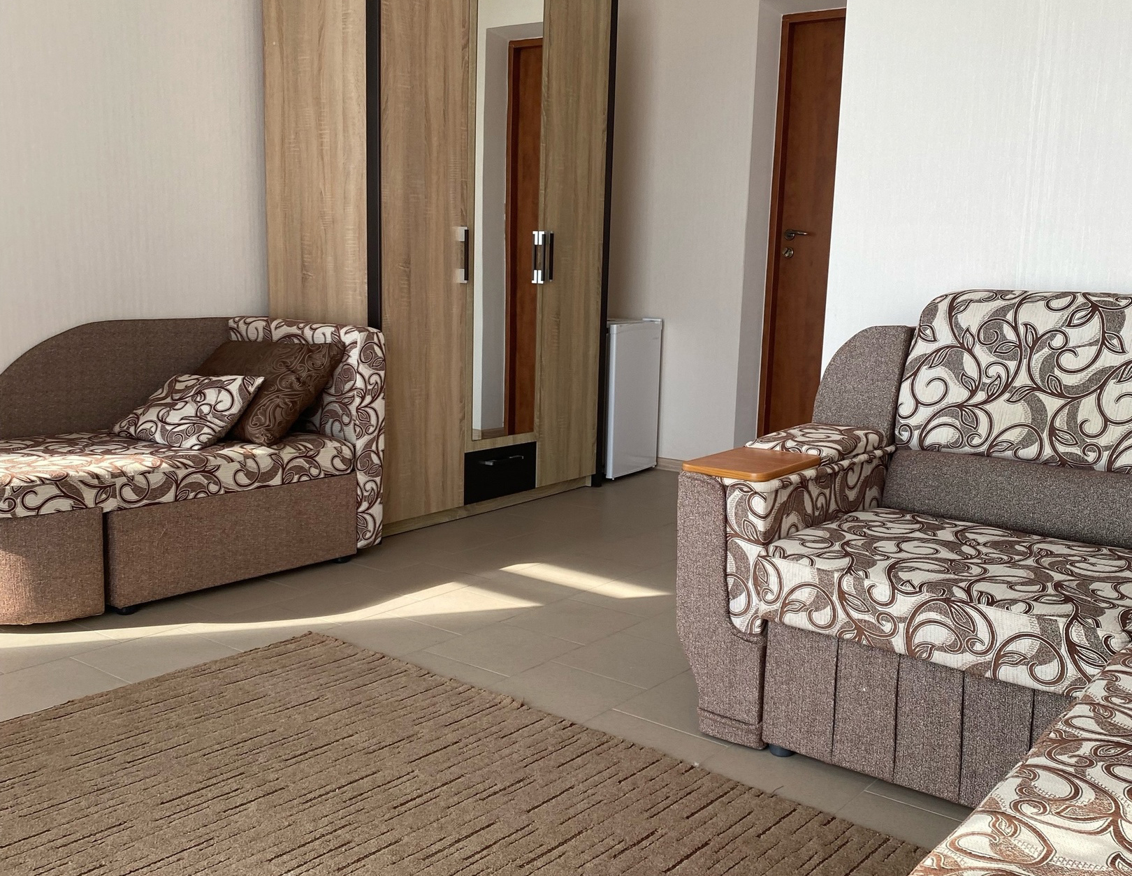 - Мебель: кресло-кровать, кровать двуспальная, кровать односпальная, прикроватные тумбочки, столик туалетный, шкаф